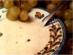 150 - 200 gramos de almendra cruda pelada Ponemos en remojo con la leche las dos rebanadas de pan, trituramos con la batidora o machacamos con el mortero las almendras hasta convertirlas en polvo fino, en el mismo recipiente de la leche y las rebanadas de pan, vertemos el aceite de oliva con el polvo de las almendras, y con la batidora batimos hasta conseguir una crema, a continuación añadimos tres vasos de agua fría con el fin de aclarar la crema, posteriormente batimos un huevo y lo mezclamos con la crema aclarada, echamos la sal al gusto y las dos cucharadas de vinagre, todo lo anterior lo introducimos en un recipiente de barro y lo dejamos enfriar en el frigorífico, cuando esté muy frío lo presentamos con las pasas o uvas, y la manzana pelada y cortada en daditos.