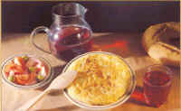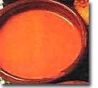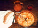 15 ctls. de aceite de oliva Se pone a calentar en una olla el caldo o el agua con las pastillas de carne y cuando esté hirviendo se añade en rebanadas el pan (debe quedar algo espeso), dejando a continuación a fuego lento este caldo con el pan, mientras tanto cortamos en láminas no muy finas los dientes de ajo (reservando 2 o 3 dientes), y aparte las ponemos a freír en una sartén pequeña a fuego lento, antes de que se doren las láminas añadimos el pimentón a la sartén removiéndolo durante 3 o 4 minutos para que no se nos queme, a continuación lo vertemos todo sobre el caldo. En un mortero ponemos los 2 o 3 dientes que hemos reservado anteriormente junto con el comino en grano y lo machamos para añadirlo a la olla. Batimos los cuatro huevos y también los añadimos a todo lo anterior, lo dejamos durante 5 minutos y las servimos en un cuenco de barro.